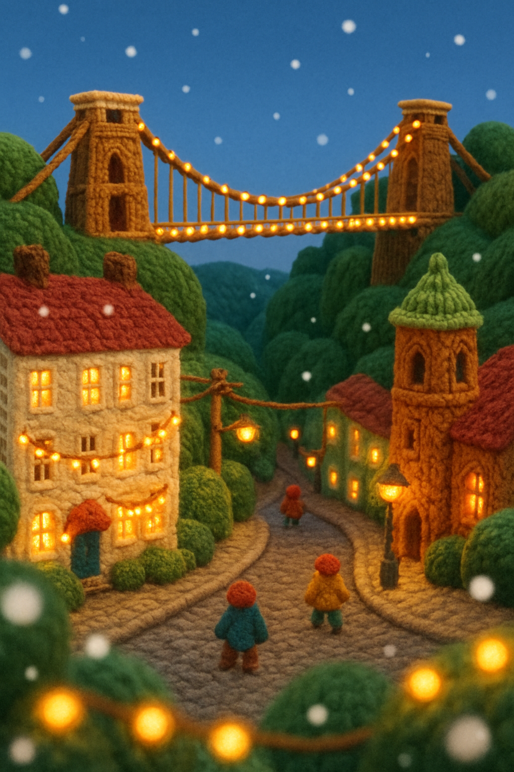 A charming winter landscape featuring knitted buildings and lush greenery, illuminated by soft lights. Snowflakes gently fall, creating a cozy holiday atmosphere.