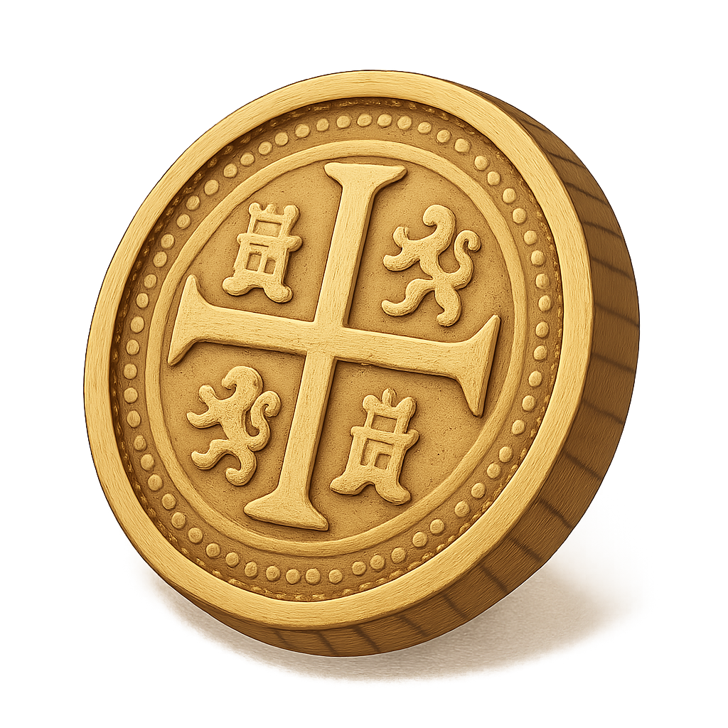 A beautifully rendered 3D icon of a Spanish real coin, showcasing intricate designs and a wood-like texture. The coin is shown in a three-quarter view, emphasizing its depth and volumetric features.