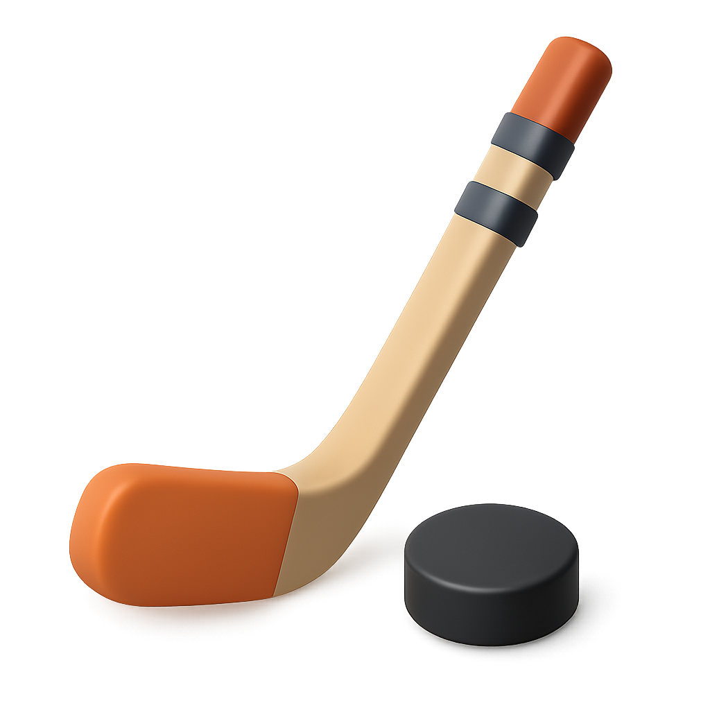 /Collection: /by davooda/Type: PNG/A visually appealing 3D icon featuring a hockey stick and puck. The stick is designed with a smooth, streamlined look, showcasing an orange and beige color scheme, while the puck is sleek and black, set against a gradient background.