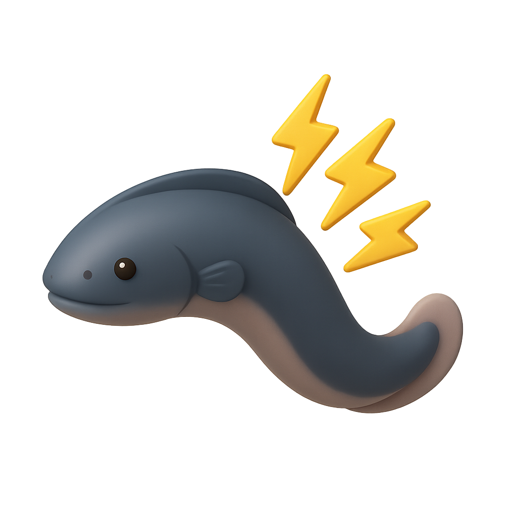 A stylized 3D representation of an electric eel with a smooth body and cute features, accompanied by yellow lightning symbols indicating shock, set against a soft gradient background.