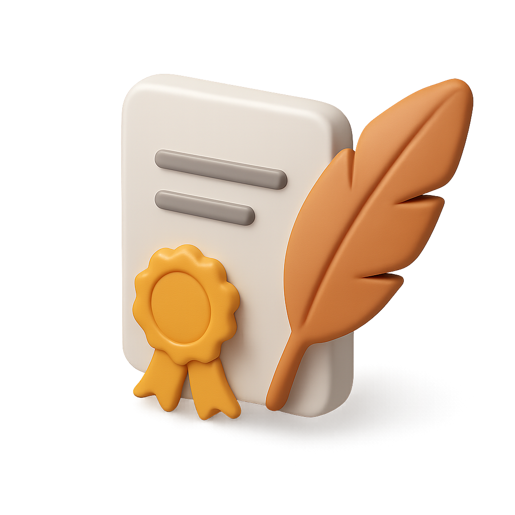 A stylized 3D icon displaying a certificate alongside a feather, featuring a transparent background and isometric perspective, emphasizing volumetric design.