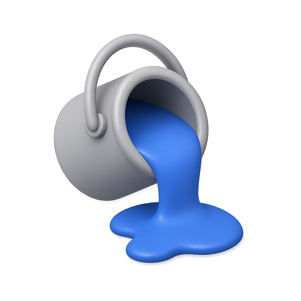 A stylized 3D icon of a paint bucket spilling vibrant blue paint. The icon is rendered in a three-quarter view with a smooth, volumetric design and a transparent background.