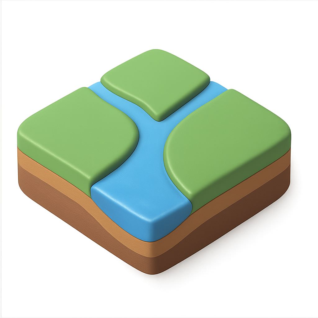 A stylized 3D representation of a river delta featuring green landmasses and a blue waterway. The icon is designed in an isometric view with a smooth, volumetric appearance.