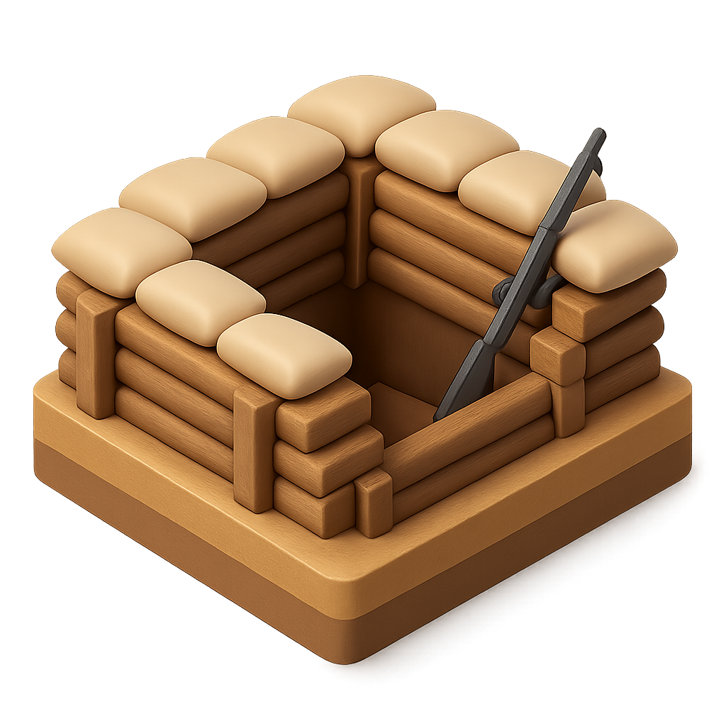 A stylized 3D icon of a World War I trench, featuring wooden logs and sandbags, viewed from a three-quarter angle, with a rifle resting inside.