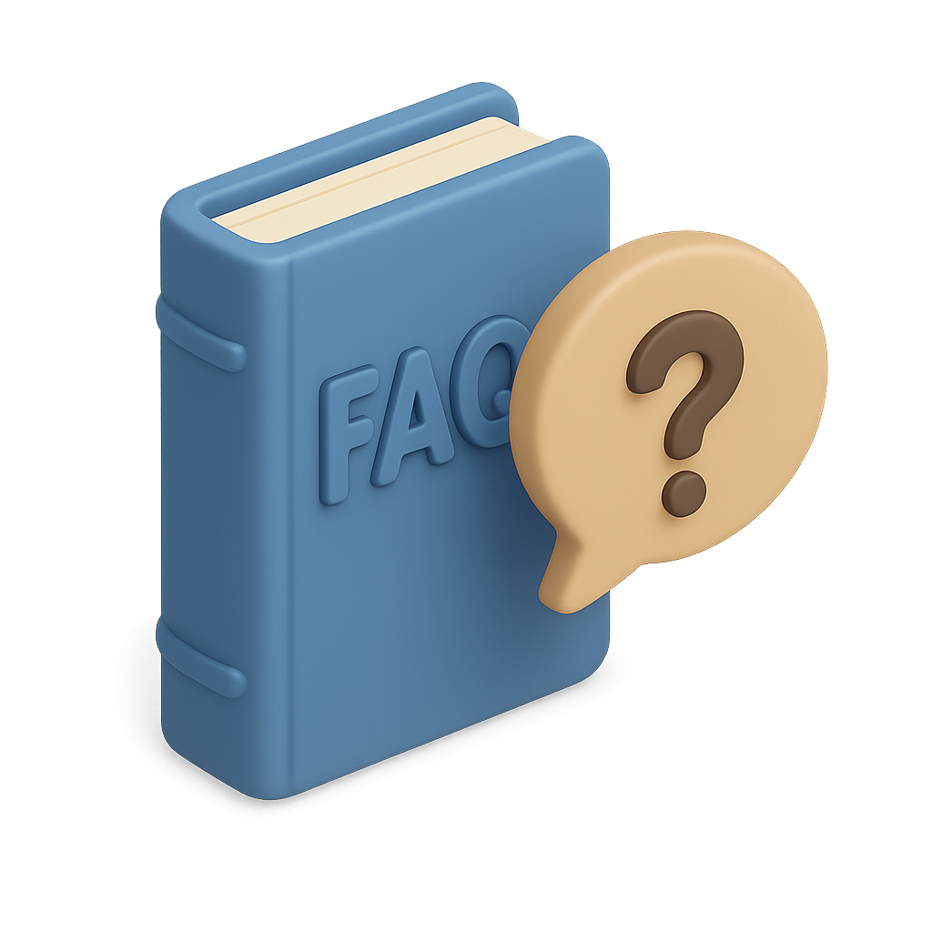 A visually appealing 3D icon featuring a blue book labeled 'FAQ' alongside a beige speech bubble with a question mark, designed with isometric and volumetric effects.