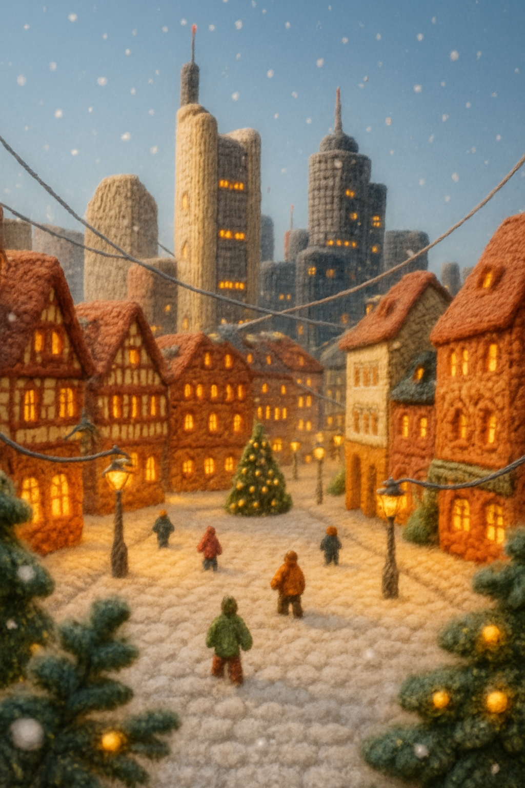 /Collection: /by davooda/Type: PNG/A whimsical winter scene in Frankfurt, showcasing a city center made of wool-like textures. Features snow, warm lights, and small figures amidst a festive atmosphere.