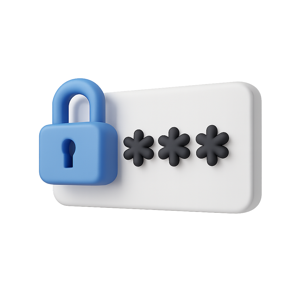 A three-dimensional password entry icon featuring a blue padlock and black asterisks on a white background, designed in an isometric style.