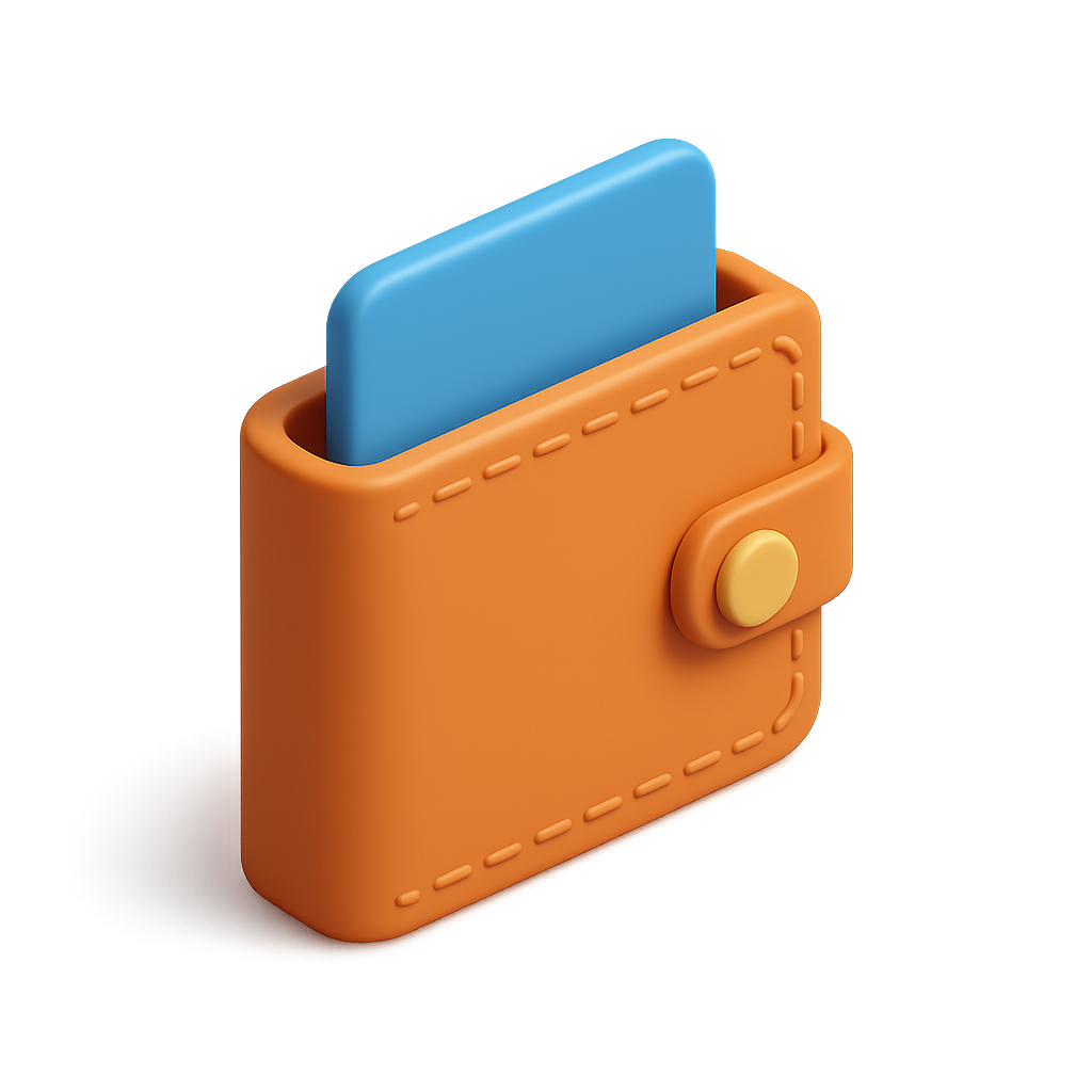 /Collection: /by davooda/Type: PNG/A visually striking 3D representation of a digital wallet in orange, featuring a blue card peeking out. The icon is designed with a modern and vibrant aesthetic, showcasing a three-quarter view and a smooth, isometric style.