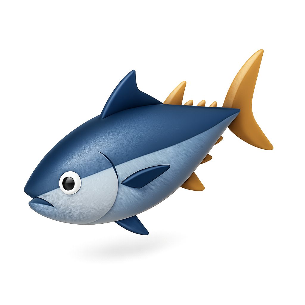 /Collection: /by davooda/Type: PNG/A stylized 3D icon of a tuna fish depicted in a three-quarter view, featuring a smooth, colorful texture. The design emphasizes a fast swimmer aesthetic with a transparent background.