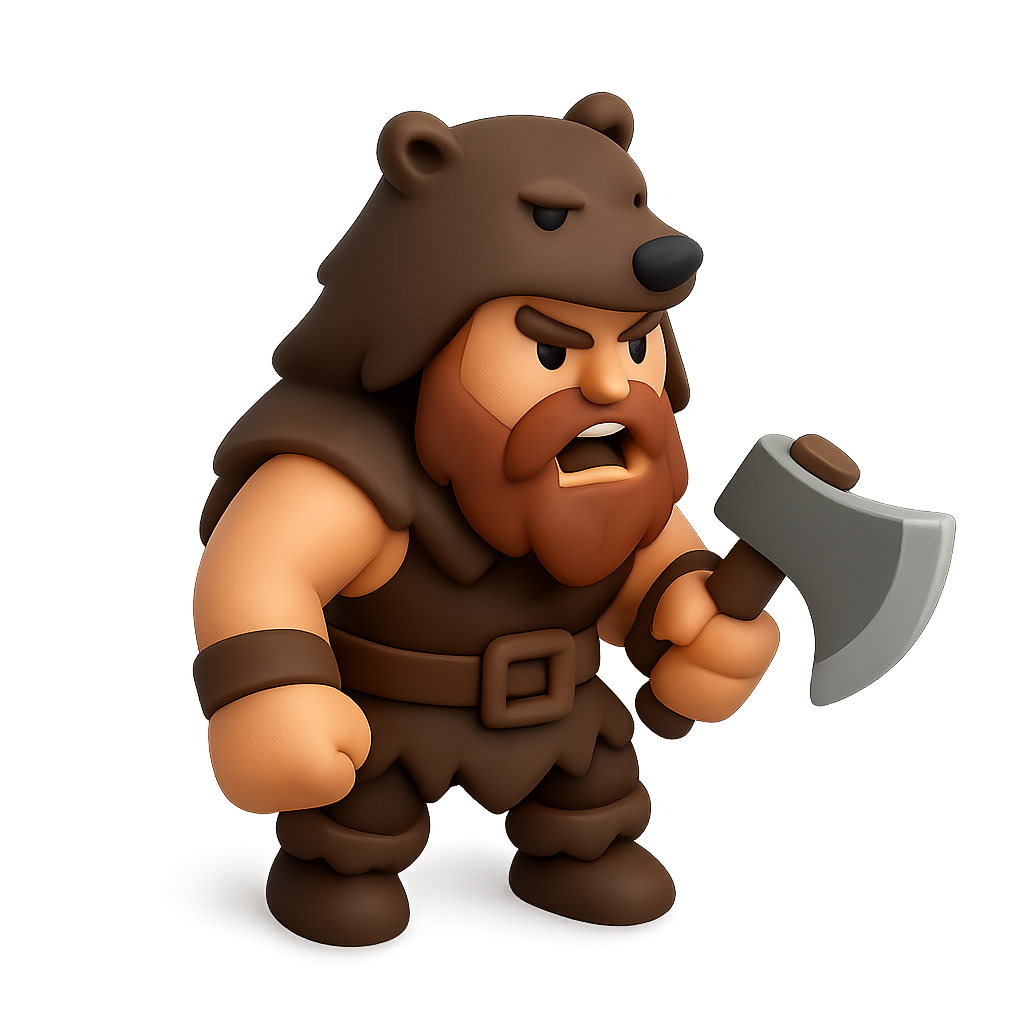 A stylized 3D icon of a Norse berserker character wearing a bear helmet. The figure is depicted in a three-quarter view, showcasing a fierce expression, wielding an axe, with a volumetric and isometric design.