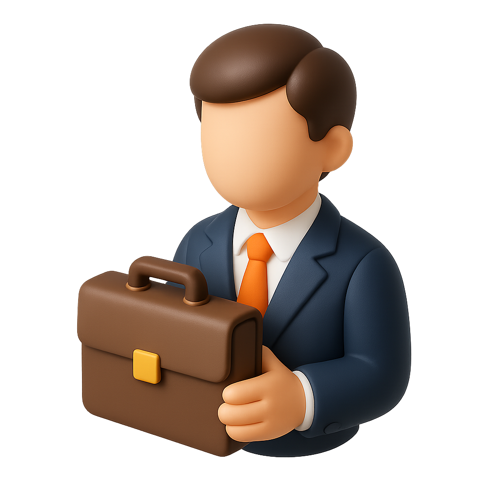 /Collection: /by davooda/Type: PNG/A stylized 3D icon representing an investment banker holding a portfolio. The figure is designed with a transparent background and features a three-quarter view for depth.