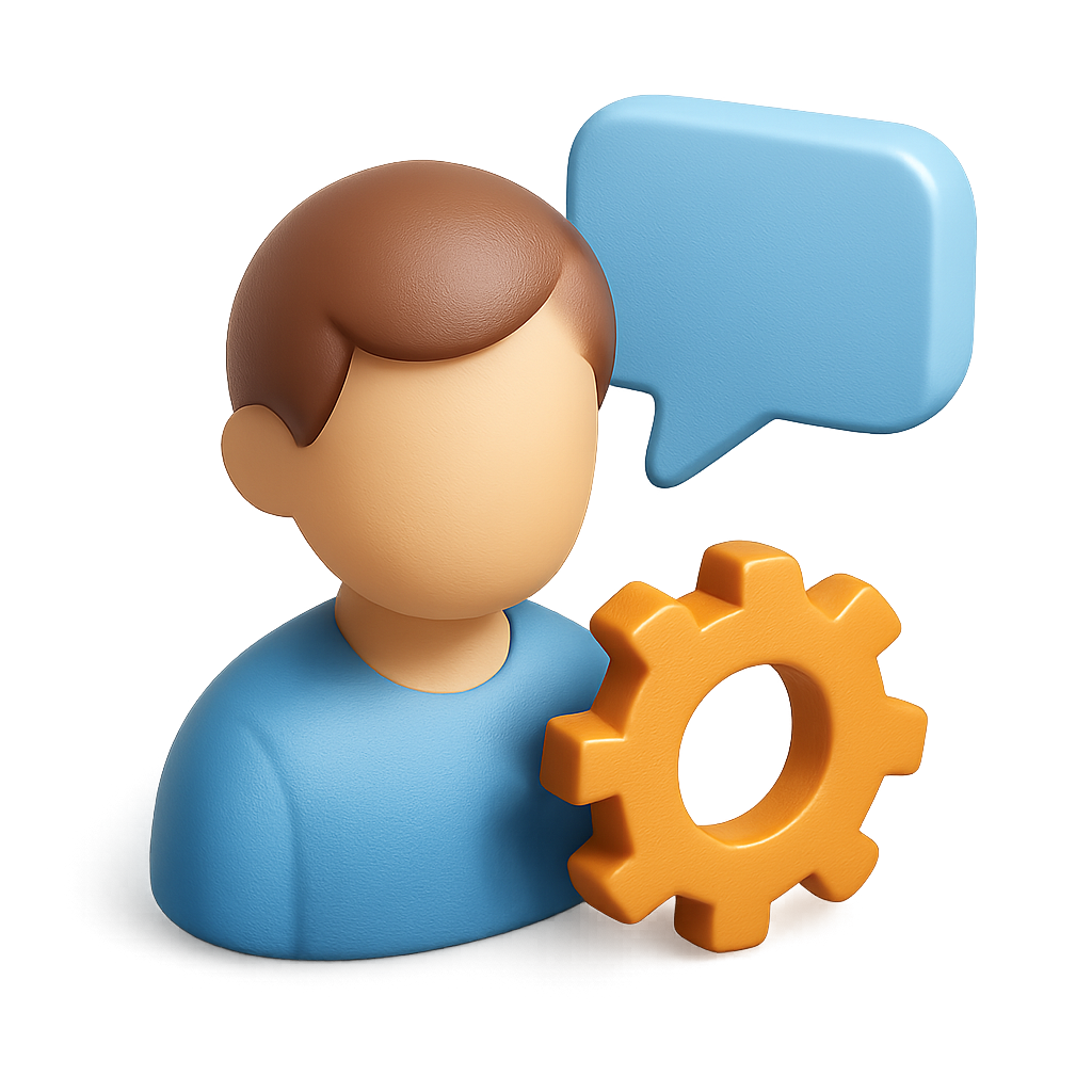A stylized 3D icon depicting a person holding a gear and a speech bubble, showcasing a vibrant isometric design with a transparent background.