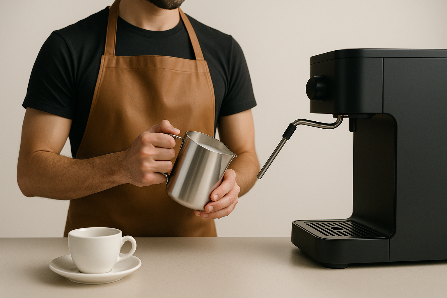 A barista in a stylish apron froths milk using a sleek espresso machine. The scene is set in a minimalist environment, highlighting the art of coffee-making.