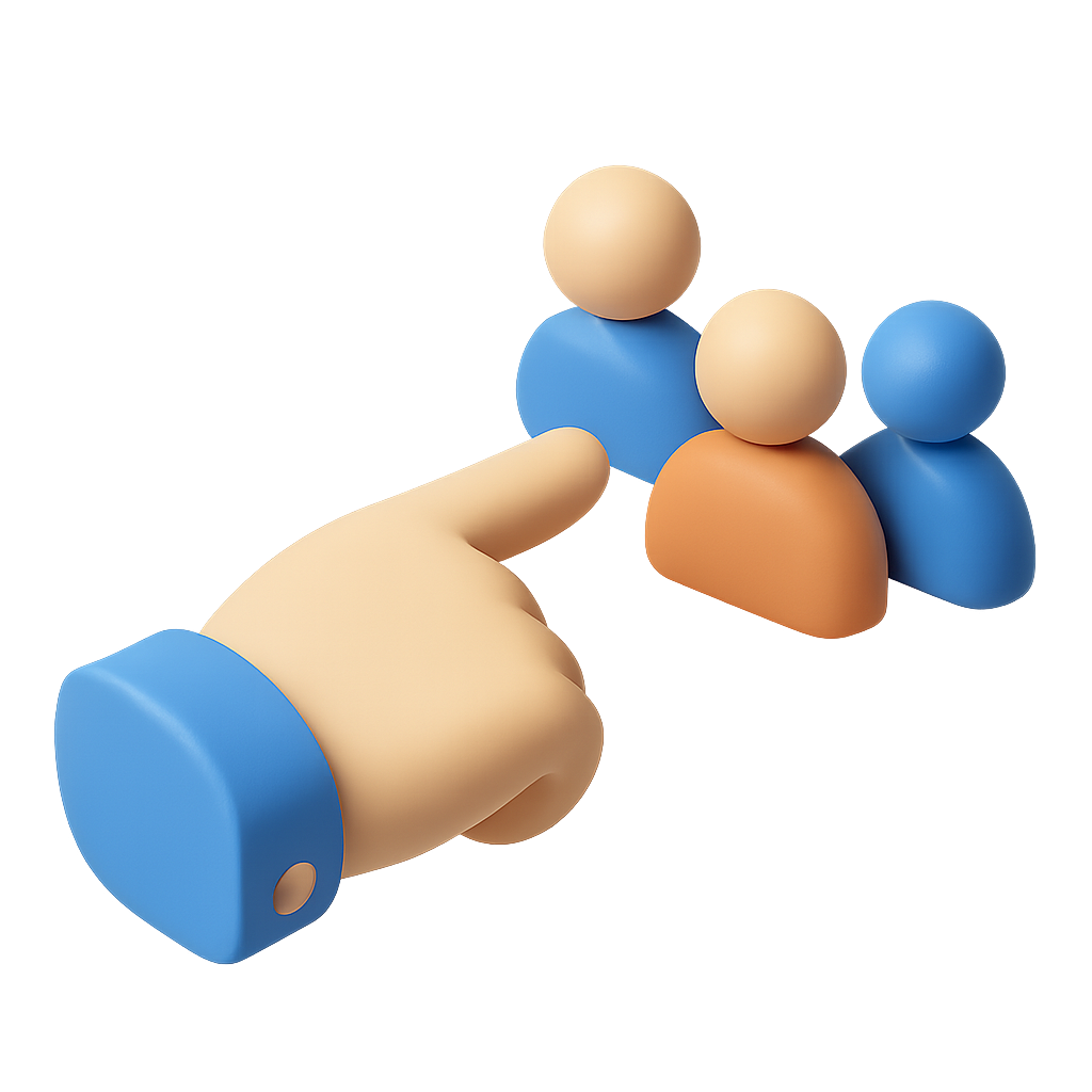 /Collection: /by davooda/Type: PNG/This image features a stylized 3D icon of a hand pointing towards three abstract figures, creating a sense of interaction. The design is isometric with a transparent background.