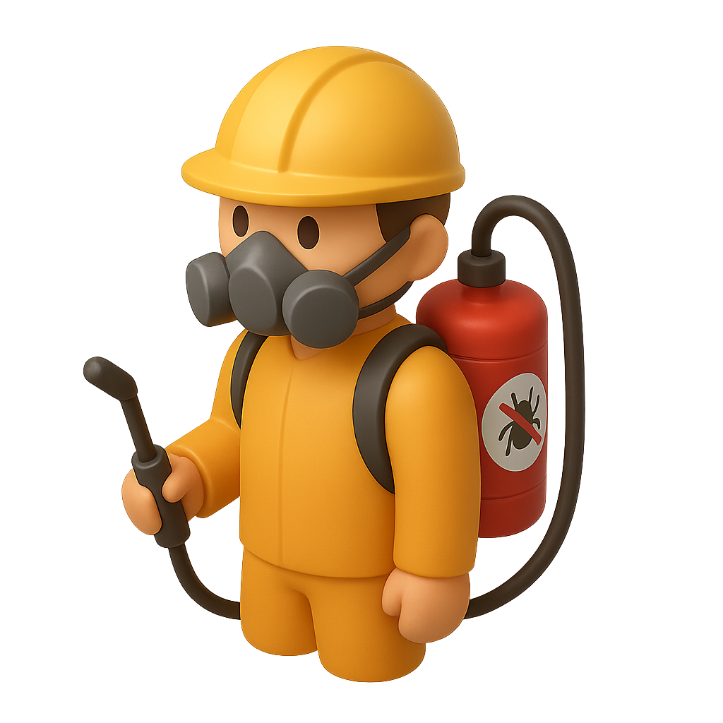 /Collection: /by davooda/Type: PNG/A 3D icon of an exterminator wearing a yellow helmet and gas mask, holding a sprayer. The character has a volumetric design and a transparent background, showcasing a three-quarter view.