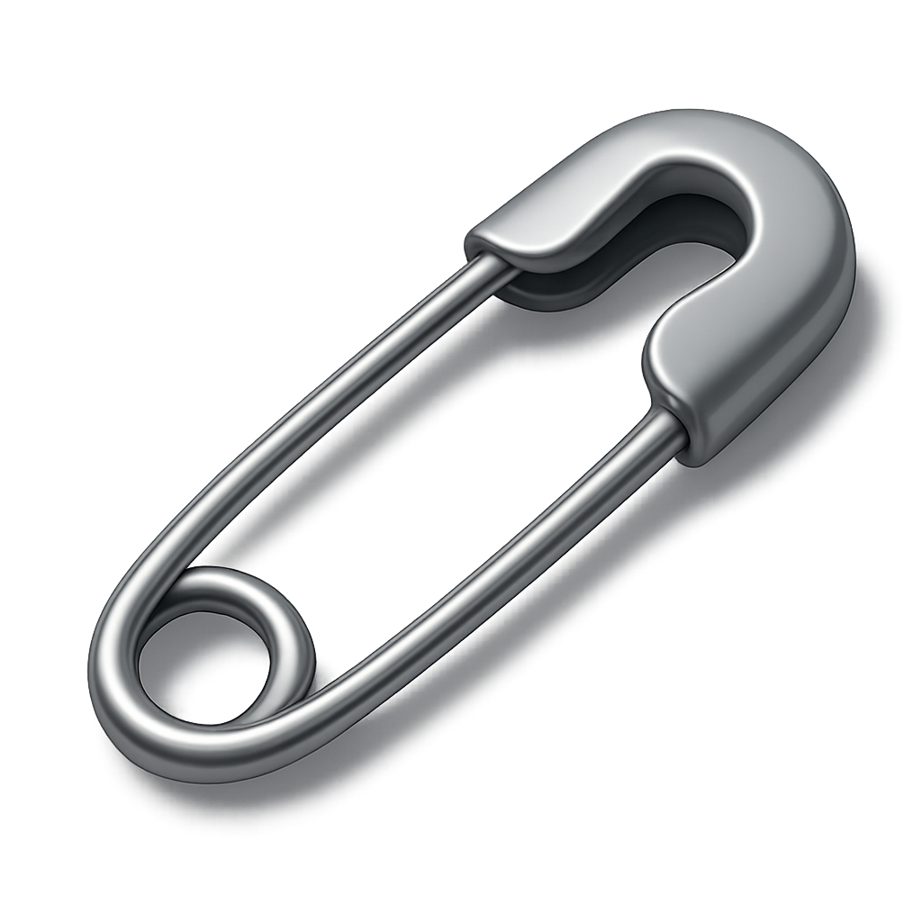 A sleek 3D representation of a safety pin, showcasing a polished metallic finish. The icon is viewed from a three-quarter angle against a soft gradient background, emphasizing its volumetric design.