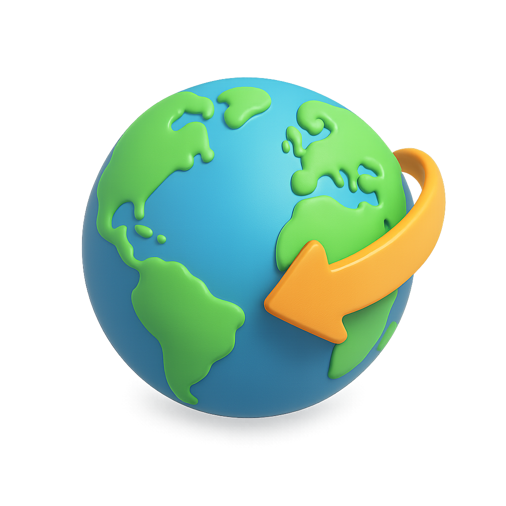 A vibrant 3D globe featuring continents in green and blue, with a prominent curved yellow arrow, presented in a three-quarter isometric view against a transparent background.