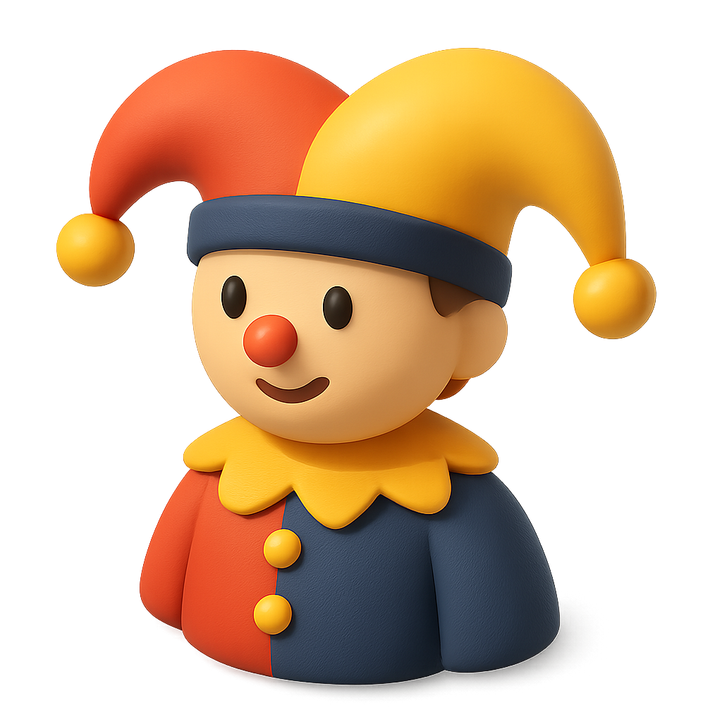 A cheerful 3D jester icon featuring vibrant colors and a playful design. The jester wears a red and blue outfit with a matching hat, presented in a three-quarter isometric view.