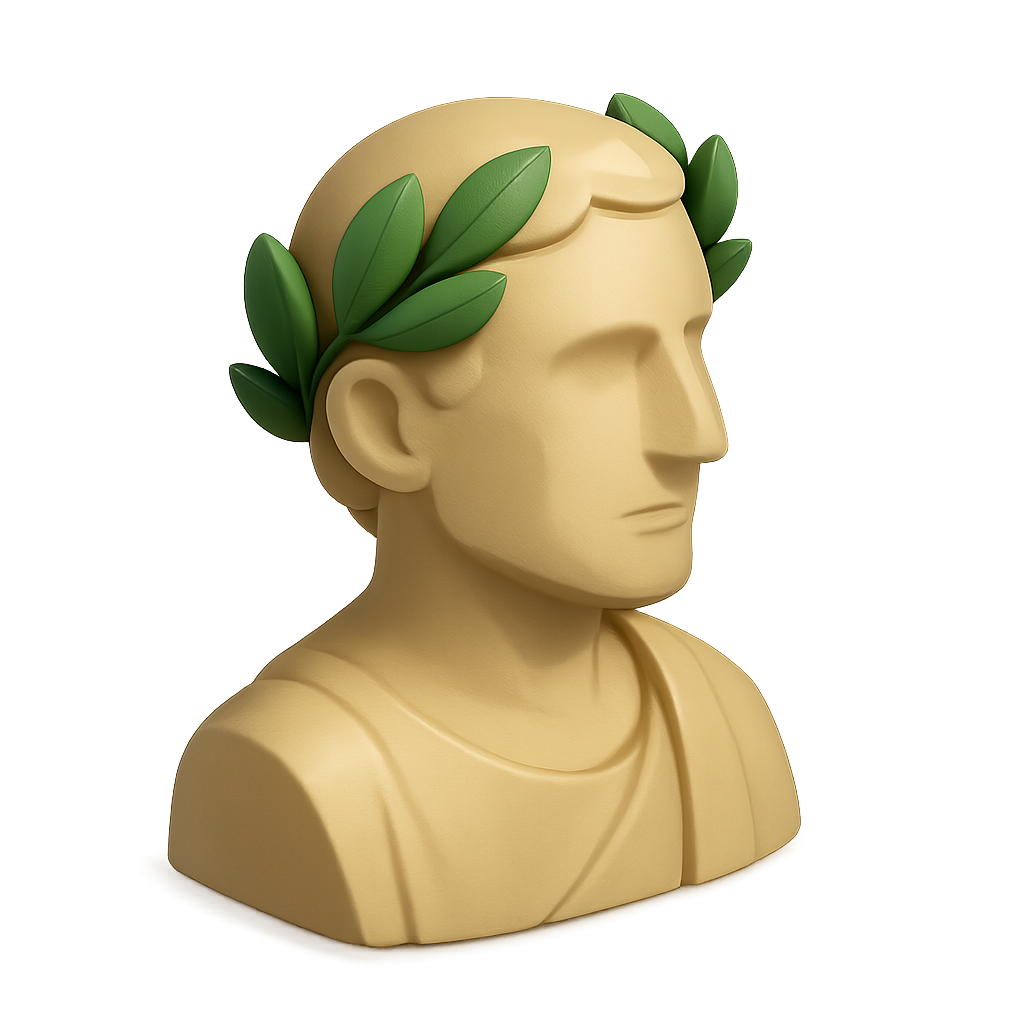 A stylized 3D bust of a figure resembling Julius Caesar, adorned with a laurel wreath. The design features a smooth texture and an isometric view, showcasing a classic profile.