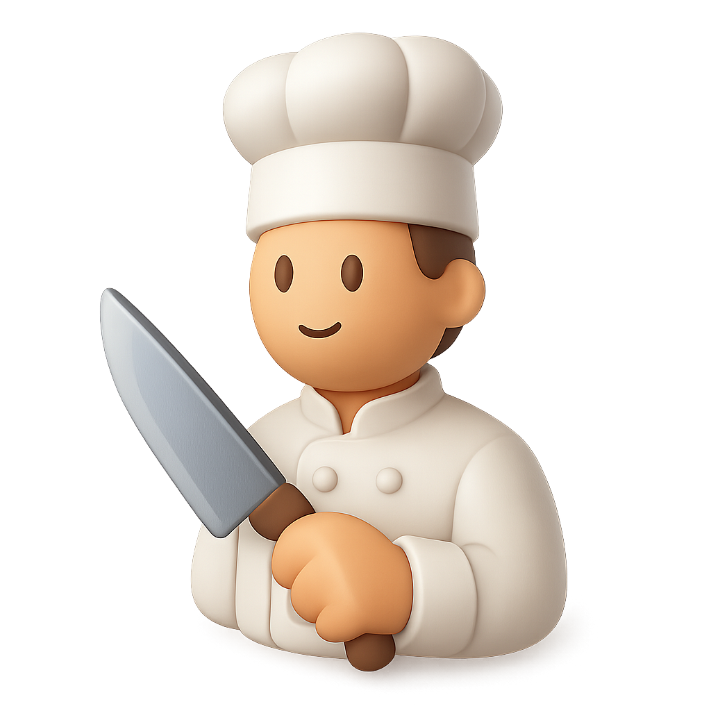 A stylized 3D chef figure holding a knife, designed in a three-quarter view. The chef has a friendly expression and wears a traditional chef's hat and coat, set against a soft gradient background.