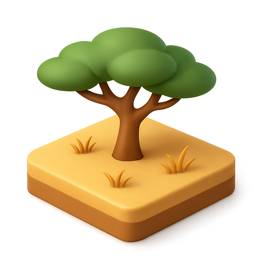 A stylized 3D icon depicting an acacia tree on a simple base with grass elements. The design features a transparent background and a three-quarter view, emphasizing its volumetric quality.