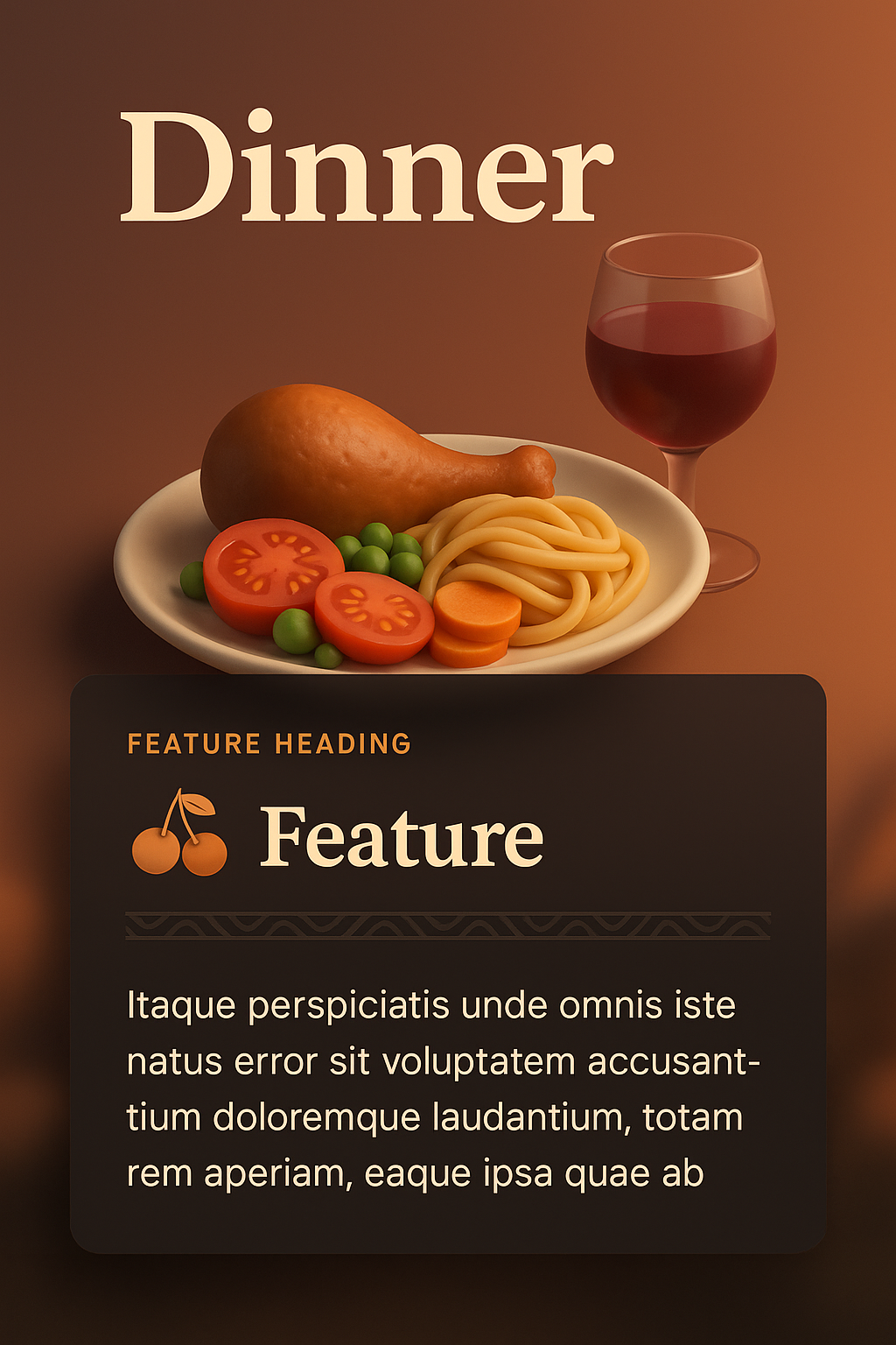 A visually appealing 3D dinner scene featuring a plate of food, including chicken, vegetables, and pasta, accompanied by a glass of wine. The design incorporates a dark panel with descriptive text.