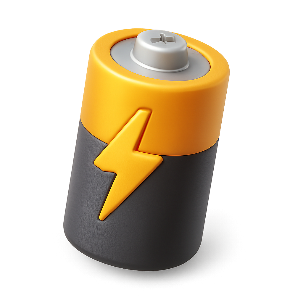/Collection: /by davooda/Type: PNG/A vibrant 3D battery icon featuring a lightning bolt, designed in a three-quarter isometric view with a transparent background. The battery is predominantly yellow and gray, showcasing a modern, volumetric style.