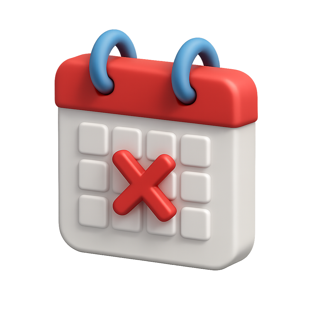 A visually striking 3D icon of a calendar featuring a prominent cancellation mark. The design showcases a red and white color scheme, with a transparent background and an isometric perspective.
