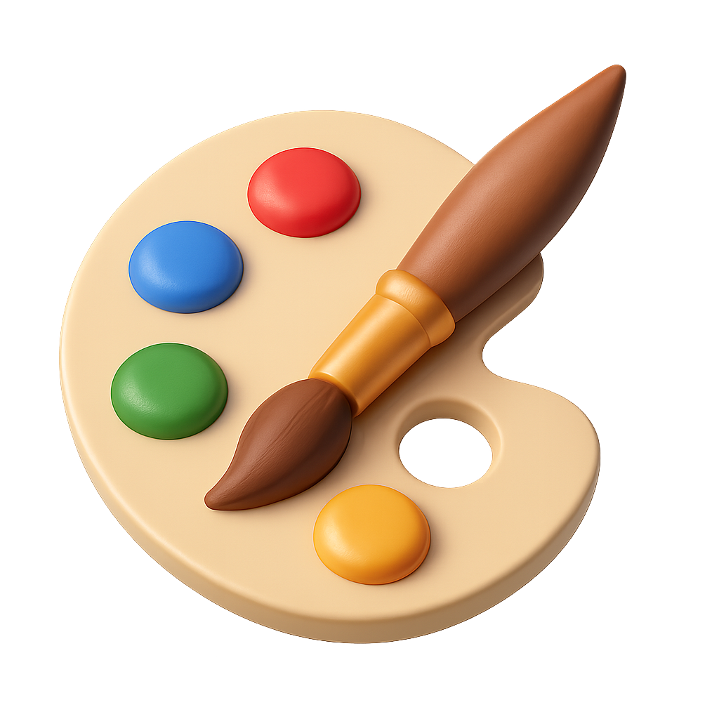 /Collection: /by davooda/Type: PNG/A colorful 3D paint palette featuring a paintbrush, arranged in an isometric perspective. The palette displays five vibrant paint spots in red, blue, green, yellow, and a smooth wooden brush.