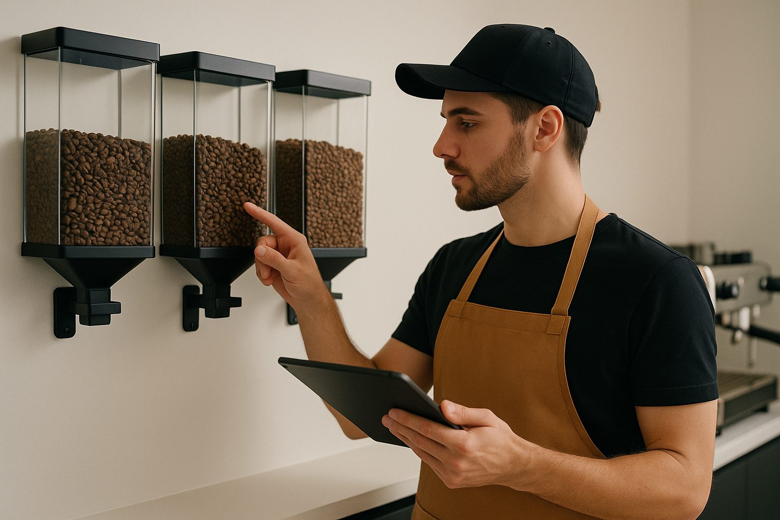 A barista inspects coffee beans stored in glass containers while using a tablet in a minimalist cafe setting. The focus is on the barista's attention to quality.