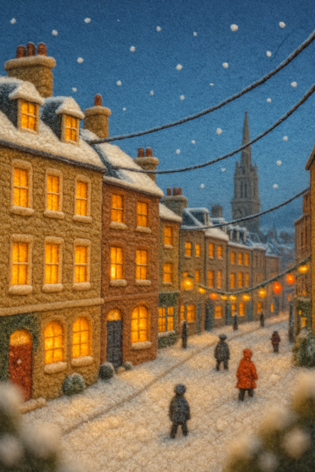 /Collection: /by davooda/Type: PNG/A cozy, three-dimensional street scene set in Edinburgh's New Town, featuring buildings made of wool-like material, with soft lighting, snowflakes, and festive decorations creating a warm holiday atmosphere.