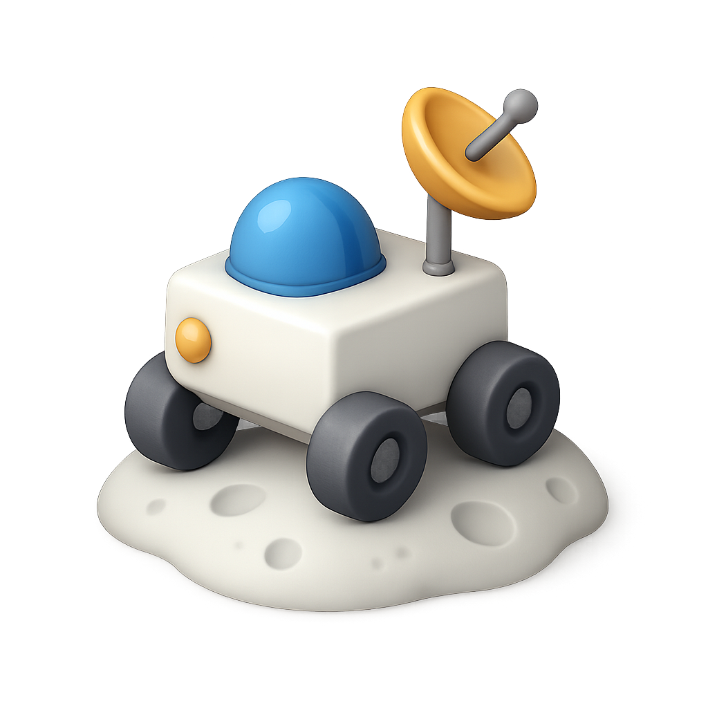 A stylized 3D icon of a lunar rover featuring a blue dome, satellite dish, and black wheels, set on a moon surface, presented in an isometric view.