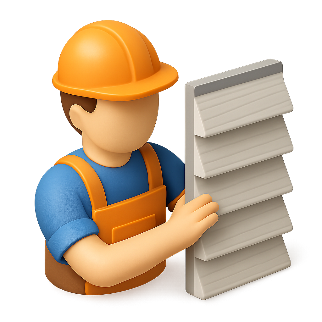 /Collection: /by davooda/Type: PNG/A 3D icon of a siding installer wearing an orange hard hat, holding siding panels. The design is in a three-quarter view with a transparent background, providing a modern isometric look.