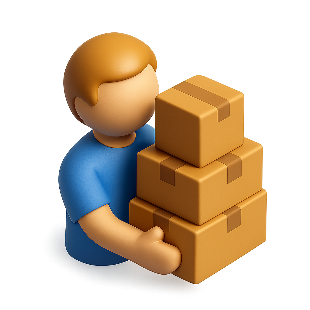 /Collection: /by davooda/Type: PNG/A stylized 3D icon depicting a person holding three stacked packages, designed in a volumetric and isometric style. The background is softly blurred, enhancing the 3D effect.