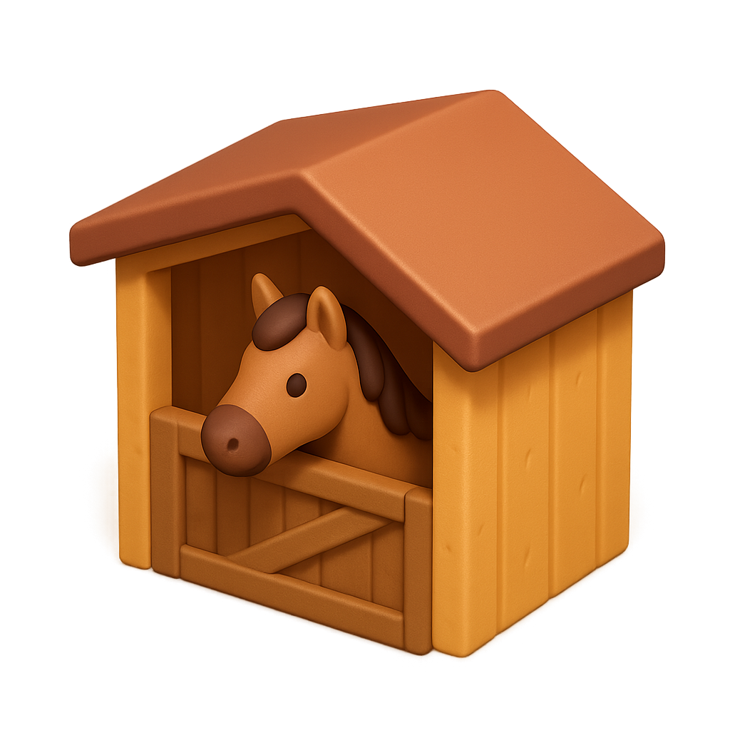 A stylized 3D icon of a horse shelter, featuring a horse peeking from a wooden stable. The design showcases a warm color palette with a volumetric feel.