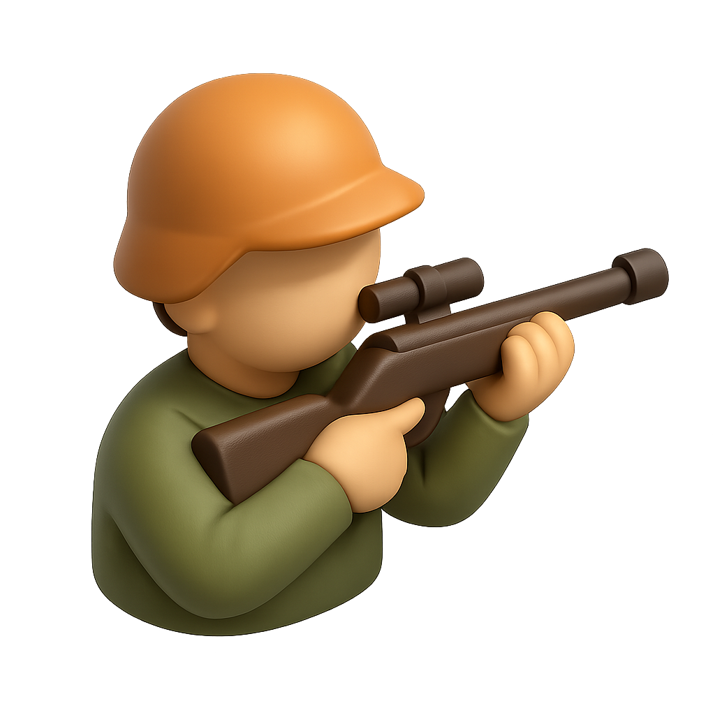 /Collection: /by davooda/Type: PNG/A stylized 3D icon of a rifleman in a three-quarter view, wearing a helmet and holding a rifle. The design features a soft, volumetric look against a gradient background.