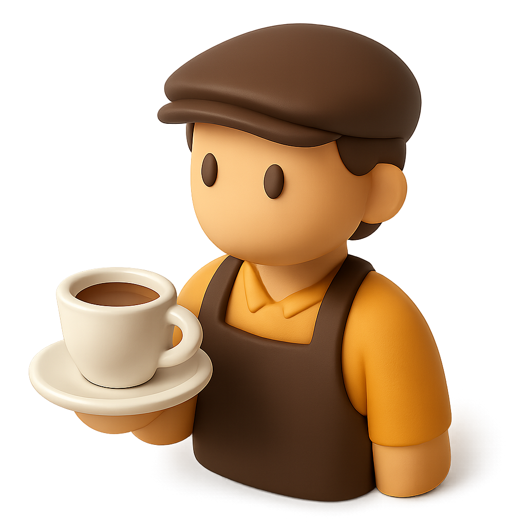 A charming 3D icon of a barista holding a coffee cup, designed in an isometric view. The character features a friendly expression, wearing a cap and an apron.
