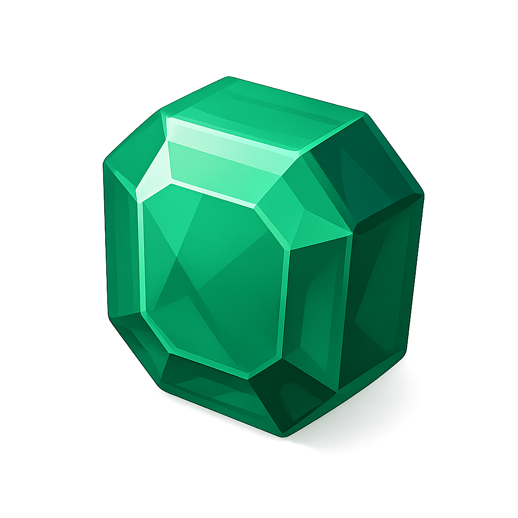 This image features a beautifully rendered 3D emerald gem with a transparent background, showcasing its facets and volumetric design in a three-quarter isometric view.