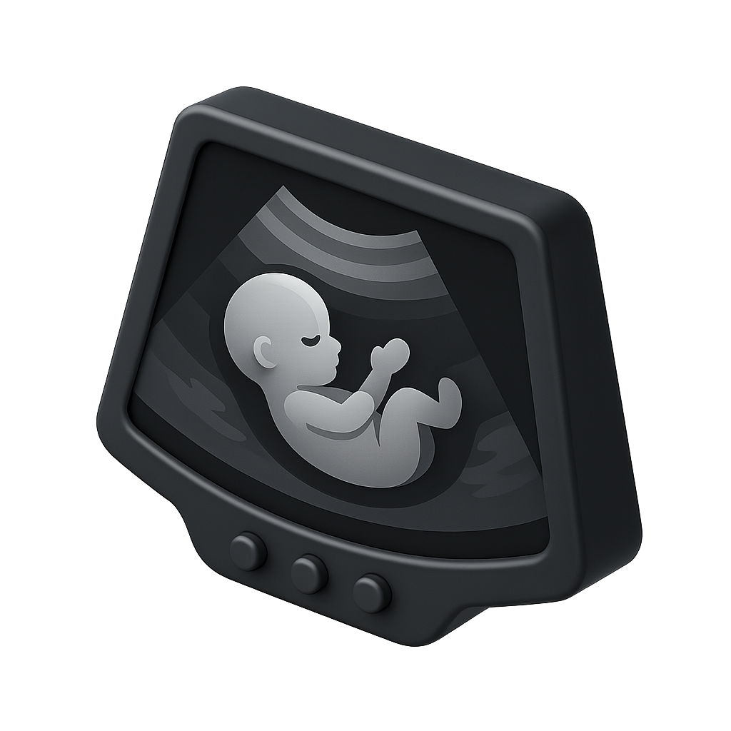 /Collection: /by davooda/Type: PNG/This 3D icon features a stylized representation of a fetus inside an ultrasound monitor. The design is isometric with a transparent background, showcasing a three-quarter view. The monochromatic color scheme emphasizes the volumetric effect.