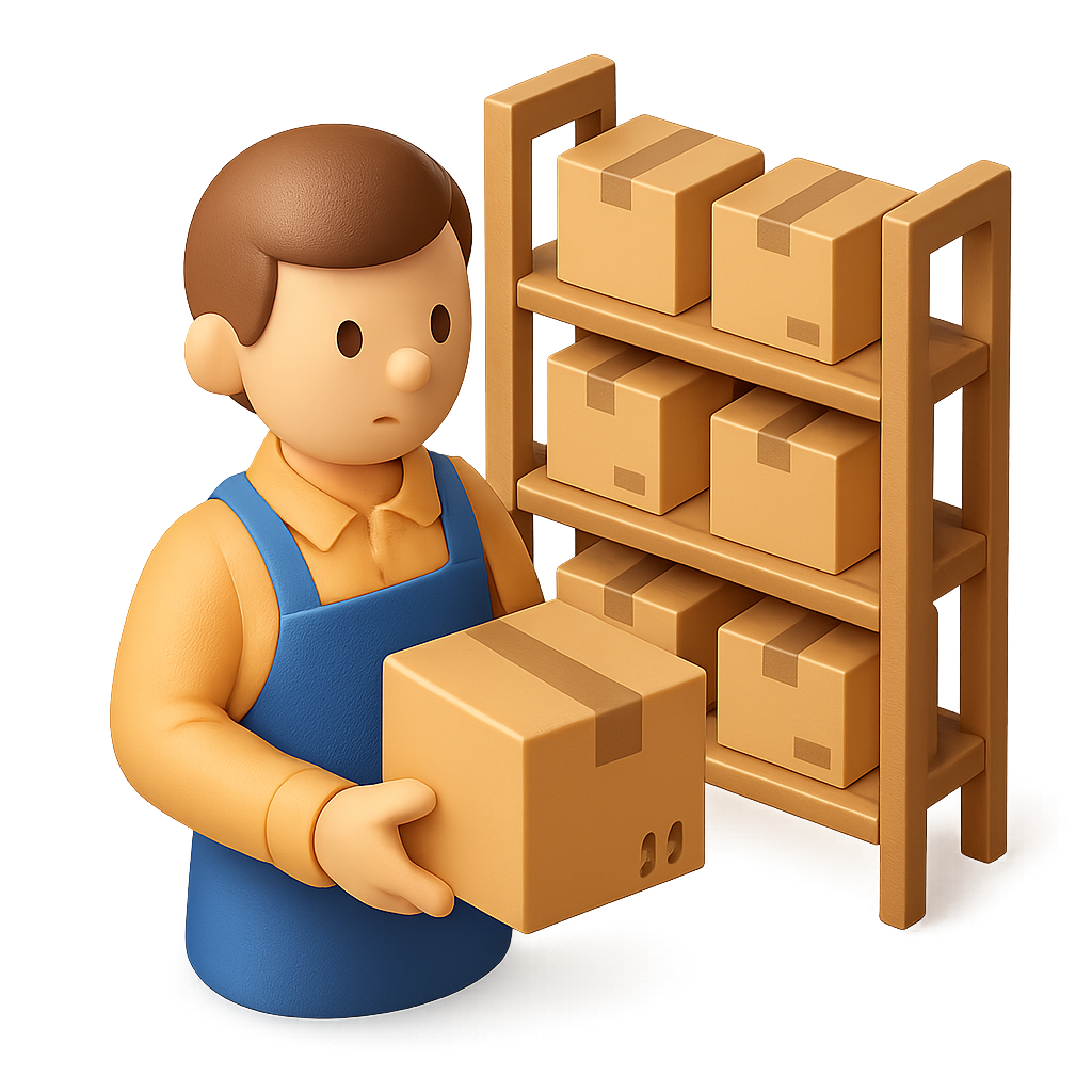 /Collection: /by davooda/Type: PNG/A 3D storekeeper character holds a box in front of a shelf filled with stacked boxes. The design features a volumetric, isometric perspective with a transparent background.