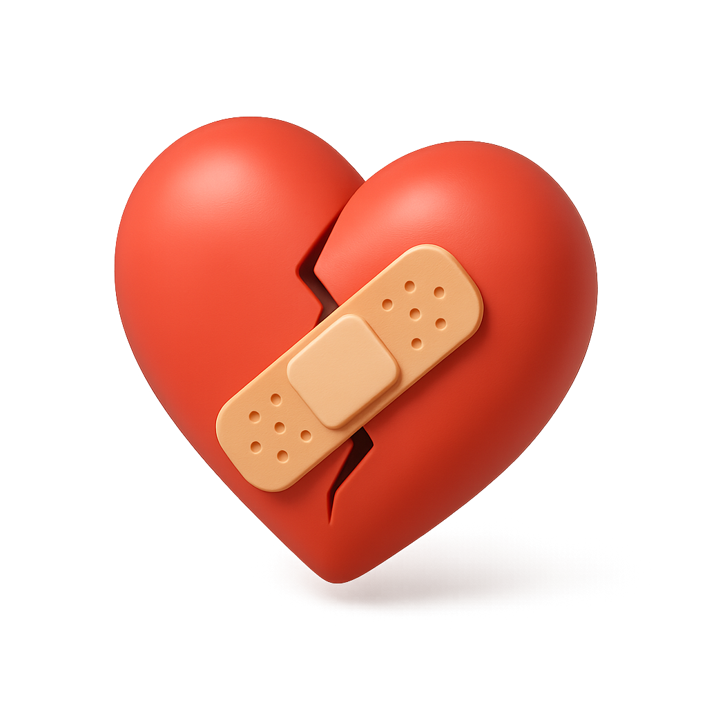 /Collection: /by davooda/Type: PNG/A stylized 3D heart icon featuring a bandage on a cracked surface, representing trauma-informed care. The design has a vibrant red color and a glossy finish, set against a soft gradient background.