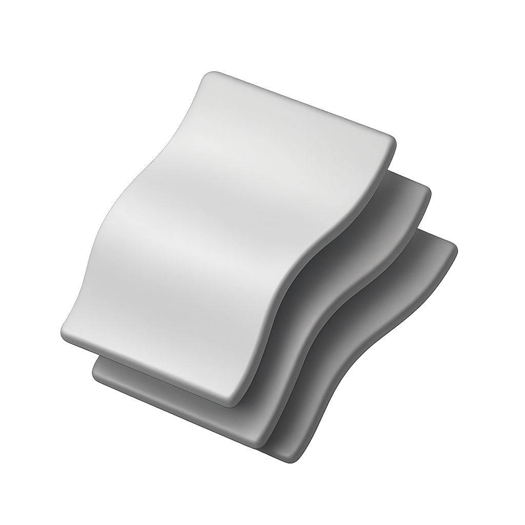 An illustration featuring three wavy sheets of paper stacked in a three-quarter view. The design emphasizes a 3D effect with smooth curves and a sleek, modern aesthetic.