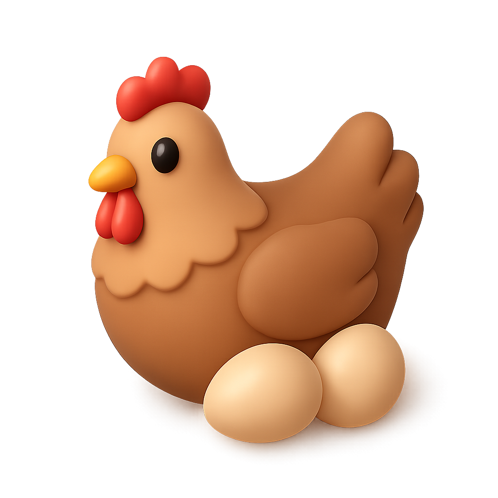 A stylized 3D icon of a hen in three-quarter view, featuring a smooth, cartoonish design. The hen is brown with a red comb and beak, accompanied by two eggs, set against a softly blurred background.