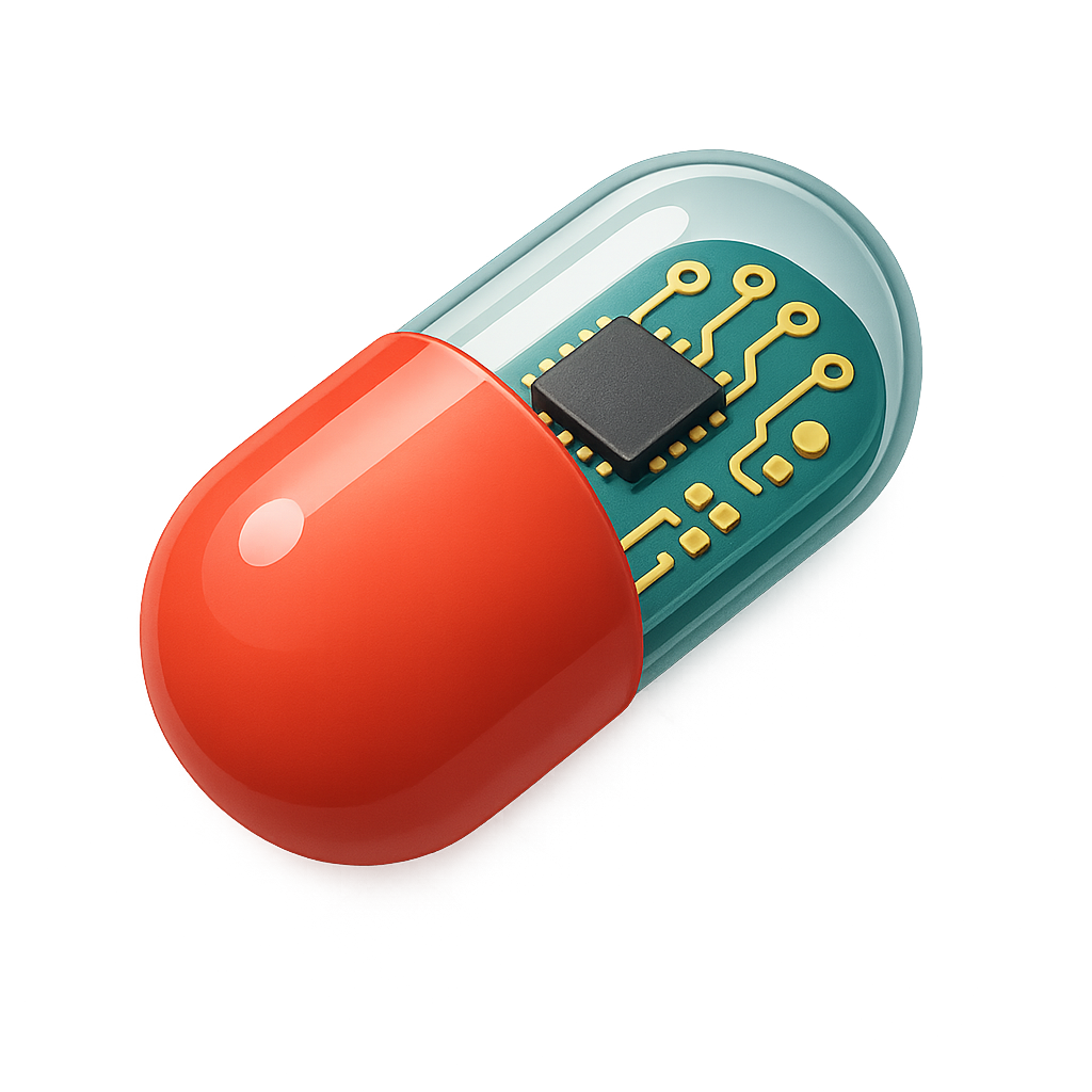 /Collection: /by davooda/Type: PNG/A visually striking 3D icon of an edible electronics pill featuring a red and transparent capsule with a detailed circuit board inside, set against a soft gradient background.