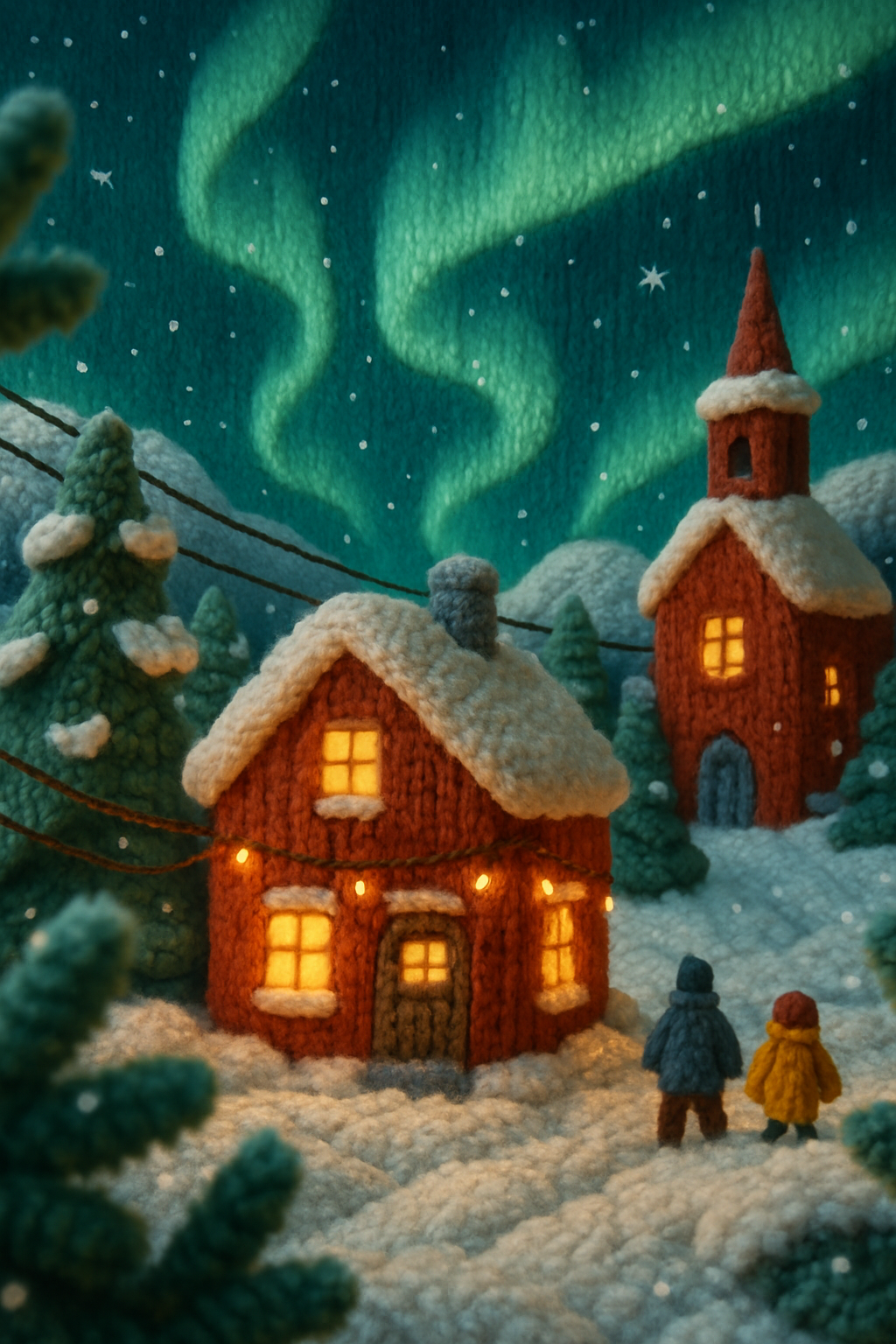 A whimsical 3D scene depicting the Northern Lights over a snowy village, with houses made of yarn and cozy lights. Small figures enjoy the festive atmosphere.