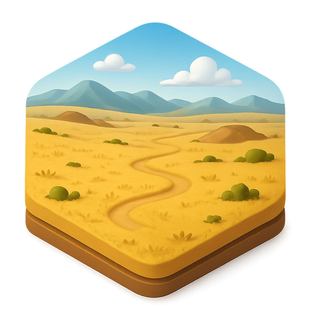 A stylized 3D icon depicting a vast steppe landscape with rolling hills, a winding path, and soft clouds against a blue sky, presented in an isometric view.