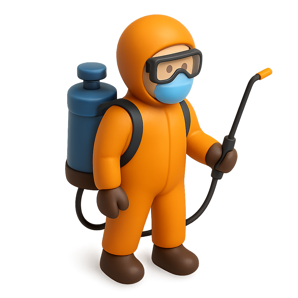 A stylized 3D icon of a pest control technician wearing an orange suit and goggles, holding a sprayer. The design features a transparent background and a three-quarter isometric perspective.