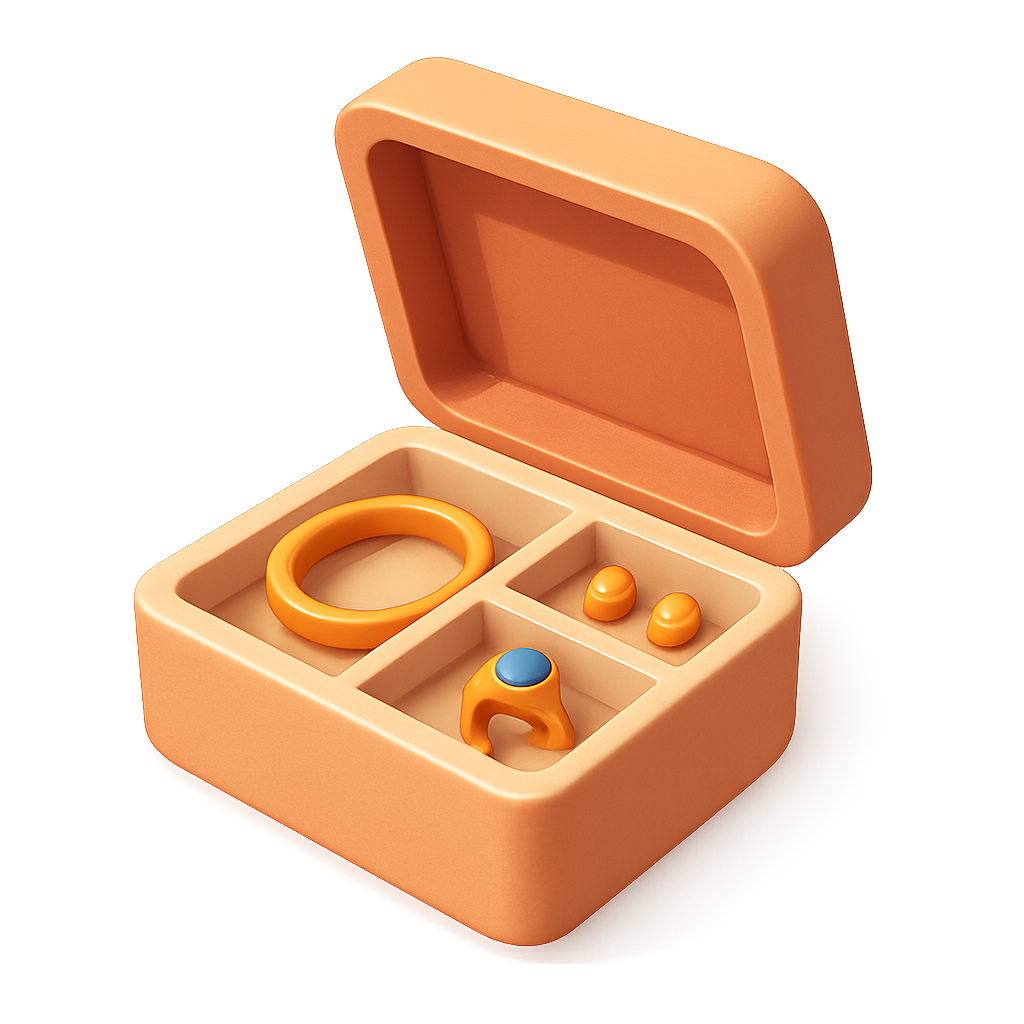 A visually appealing 3D icon of a jewelry box with compartments, featuring a ring, earrings, and a decorative piece. The design showcases a smooth, volumetric style with a warm color palette.