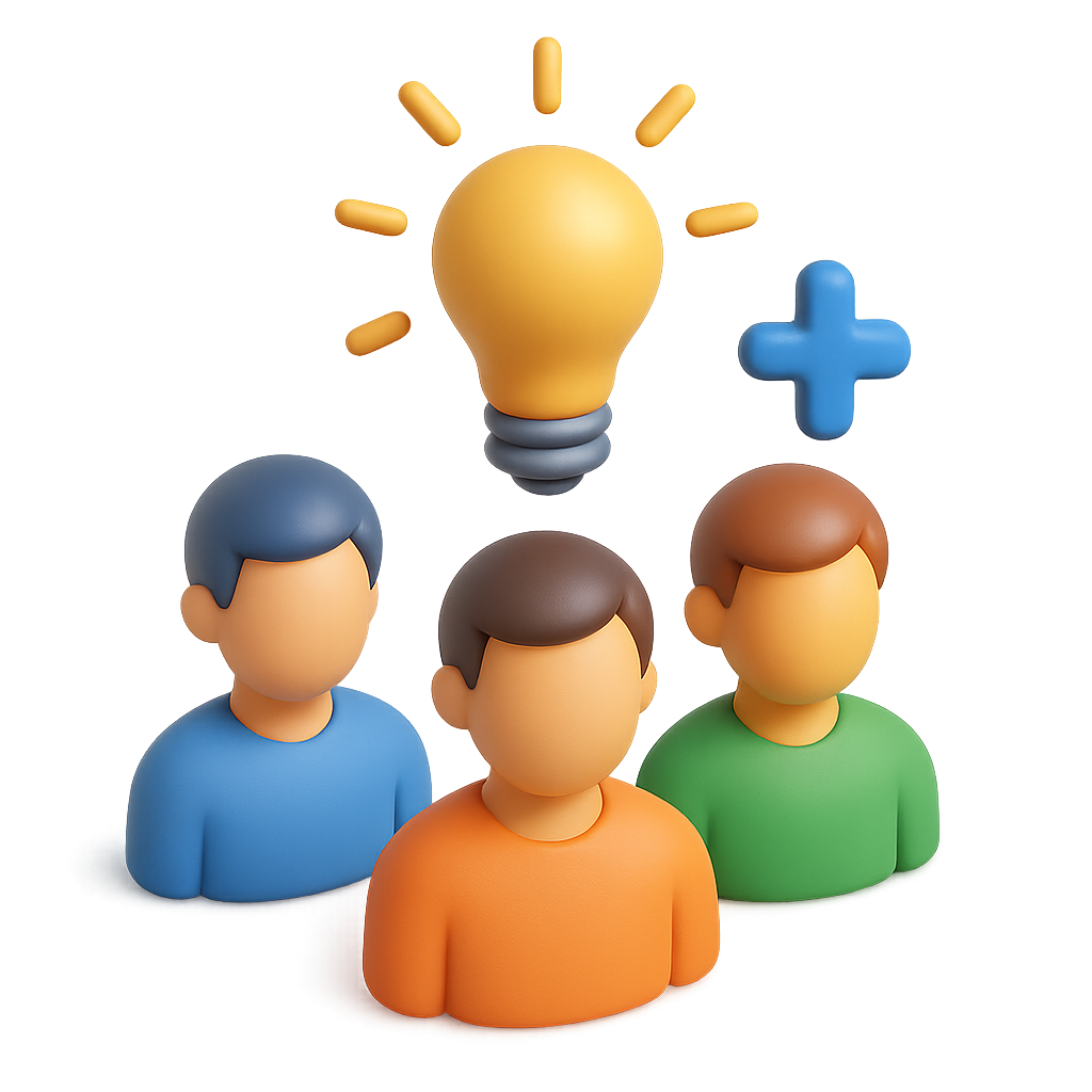 A vibrant 3D icon featuring three stylized figures in blue, orange, and green, with a glowing lightbulb above, symbolizing creativity and collaboration.