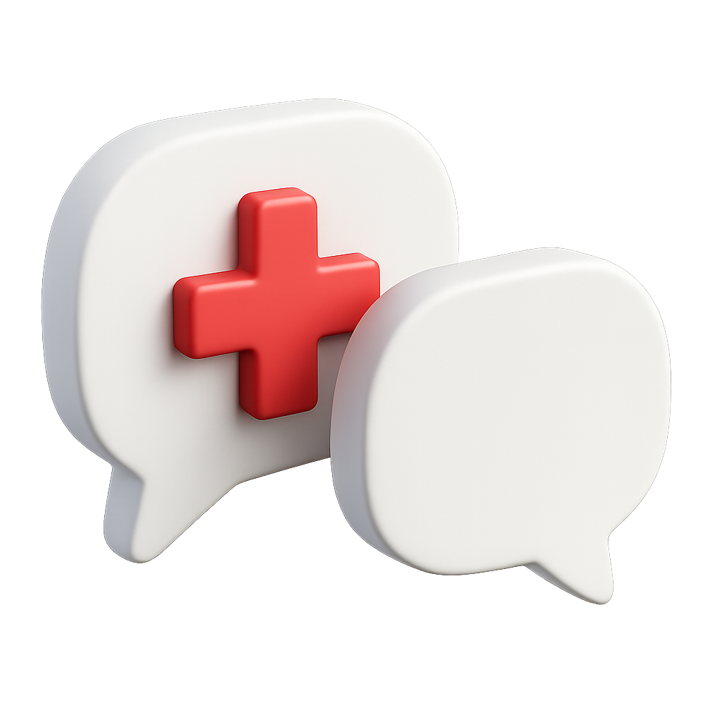 Two stylized 3D speech bubbles featuring a prominent red medical cross. The design showcases a modern isometric style with a transparent background, emphasizing a medical theme.